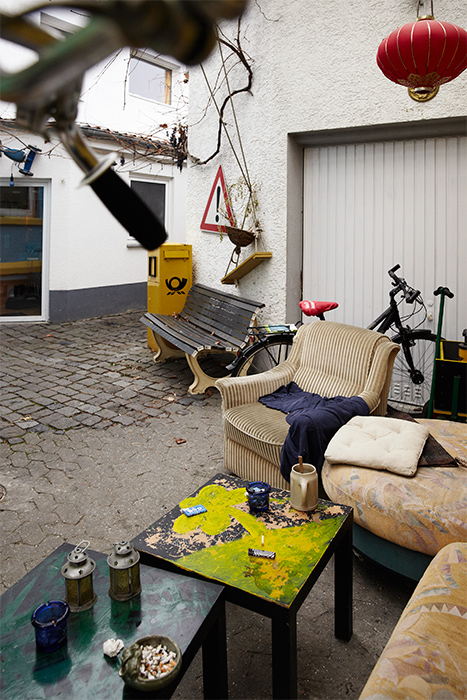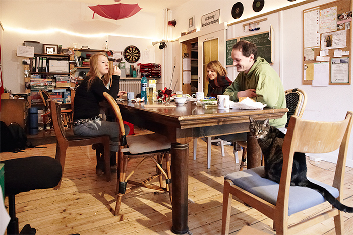 Mehrmals im Jahr finden WG-Sitzungen statt, bei denen Regeln vereinbart, Feste geplant, WG-Castings abgehalten und demokratisch abgestimmt wird. Hier fliegen auch schon mal die Fetzen. Da man nicht immer jeden antrifft, kommuniziert die WG auch über Doodle, Whats App, Facebook oder ganz klassisch über die Wohnzimmertafel. Außerdem gibt’s ein internes Telefon, einen WG-Computer und eine Videothek im Keller. „Der Sinn einer Gemeinschaft liegt auch darin, dass man gemeinsame Interessen und Aktivitäten teilt. Auch hiernach suchen wir Neulinge aus“, erzählt Anna, die nach Dennis und Rudi mit sieben Jahren Aufenthalt die drittdienstälteste Mieterin ist. Außer ihr wohnen noch Catalina, Jörg, Tina, Lydia, Lukas, Jenny, Martha und Sebastian plus Katze im Haus. Alle auf einmal zusammen zu kriegen, ist gar nicht so einfach. Das letzte Highlight war die 10-jährige Jubiläumsfeier im Sommer. Letzten Winter gab es ein geniales Wohnzimmerkonzert für Freunde mit dem gerade ausgezogenen Jazzmusiker Rob und seiner Band, den Electrocoustics. Dafür wurde im geschmückten Wohn- und Esszimmer Platz für ein Schlagzeug, ein Keyboard und den Trompeter geschaffen. Ein weiteres Highlight in diesem Kontext: die WG-eigene Zapfanlage in der Küche! „Im Prinzip hat hier jeder Raum seine eigene Kreativität. Dennis hat uns den Raum geschaffen, damit wir uns entfalten können und wir stecken viel Liebe in dieses Haus“, sagt Catalina und Lukas ergänzt: „Es ist zwar nicht alles immer nur problemlos und nicht alle harmonieren gleich gut, aber es ist immer jemand da, wenn man jemanden braucht. Diese WG hat sehr viel aus ihren Erfahrungen gelernt und das macht sie so liebenswürdig.“