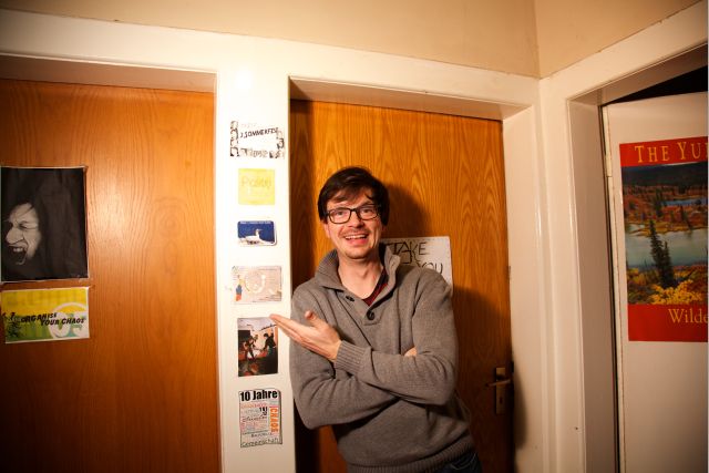 „Unser Keller ist das Highlight, hier unten erfährt man, was trockner Regen ist“, schmunzelt Dennis amüsiert, während an seinem Kopf vorbei unzählige Holzpellets durch die Rohre in den Ofen fliegen und Geräusche wie bei einem heftigen Regenschauer verursachen. Darauf ist der WG-Gründer, Hausbesitzer und Mitbewohner besonders stolz, denn Pellets sind die CO2-freundlichste Heizmethode bisher. Auf dem Dach ließ er Solarkollektoren installieren. Den sportlichen 35 Jahre alten Informatiker mit der Hornbrille und kurzen braunen Haaren nennt die WG liebevoll den „WG-Papa mit enormem Wissensvorsprung“.