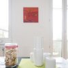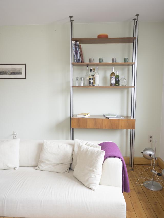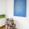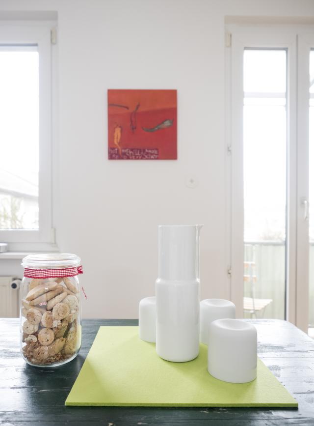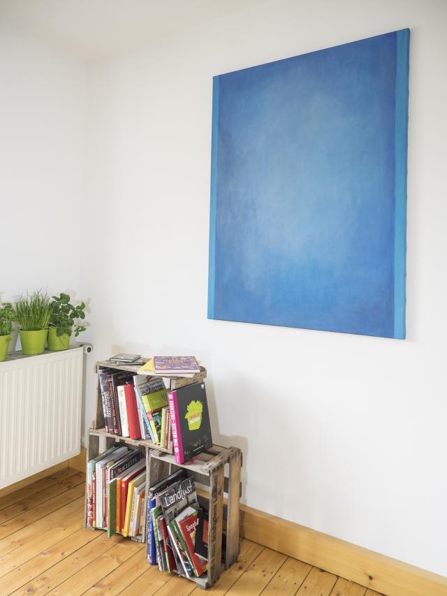 Das Sofa, eine Beinahe-Antiquität aus den 60ern, lässt sich bequem zur Schlafcouch ausbauen. Bilder schmücken den Raum, viele gemalt von Freunden und Bekannten. Die Wohnung war daher auch schon bei der Kunstaktion „3 x klingeln“ dabei, auf der Privatleute ihre Wohnungen für Künstler und Publikum öffnen.