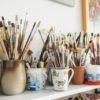 „Ich wollte eigentlich nie in einem Hochhaus leben“, gesteht Habet. Doch nun ist sie sehr zufrieden mit ihrer Wohnsituation. Nur der Atelierraum ist manchmal zu klein. „Wenn ich auf richtig große Formate will, kann ich das Atelier einer Freundin nutzen.“ Die immense Pinselgalerie auf dem Wandbord deutet darauf hin, dass das Habet´sche Studio sehr häufig genutzt wird. „Ich male jeden Tag“, erklärt sie. Auf den Staffeleien die Leinwände mit unterschiedliche Techniken, Aquarell, Kreide, meist Acryl „Ich bin ungeduldig“, bekennt die Malerin „Ölfarben brauchen so lange zum Trocknen.“ Oft arbeitet sie an mehreren Werken parallel Das größte Bild, das ich bisher gemalt habe war 2,80 x 3 Meter groß. Eine Auftragsarbeit, an der ich drei Wochen gearbeitet habe. Wenn ich Geld brauchte, hab ich auch schon mal kopiert.“ Das Gemälde von Klimt, „Der Kuss“ war eine solche Auftragskopie und auch das Bild neben dem Eingang ist der kleinere Entwurf zu einem Chagall. „Aber ich reproduziere niemals eins zu eins. Ich füge immer etwas Eigenes hinzu.“ Winzige, zart gestrichelte Figürchen zum Beispiel, die sich auf der Bildoberfläche tanzend bewegen. Und natürlich immer wieder Katzen.