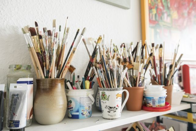 „Ich wollte eigentlich nie in einem Hochhaus leben“, gesteht Habet. Doch nun ist sie sehr zufrieden mit ihrer Wohnsituation. Nur der Atelierraum ist manchmal zu klein. „Wenn ich auf richtig große Formate will, kann ich das Atelier einer Freundin nutzen.“ Die immense Pinselgalerie auf dem Wandbord deutet darauf hin, dass das Habet´sche Studio sehr häufig genutzt wird. „Ich male jeden Tag“, erklärt sie. Auf den Staffeleien die Leinwände mit unterschiedliche Techniken, Aquarell, Kreide, meist Acryl „Ich bin ungeduldig“, bekennt die Malerin „Ölfarben brauchen so lange zum Trocknen.“ Oft arbeitet sie an mehreren Werken parallel Das größte Bild, das ich bisher gemalt habe war 2,80 x 3 Meter groß. Eine Auftragsarbeit, an der ich drei Wochen gearbeitet habe. Wenn ich Geld brauchte, hab ich auch schon mal kopiert.“ Das Gemälde von Klimt, „Der Kuss“ war eine solche Auftragskopie und auch das Bild neben dem Eingang ist der kleinere Entwurf zu einem Chagall. „Aber ich reproduziere niemals eins zu eins. Ich füge immer etwas Eigenes hinzu.“ Winzige, zart gestrichelte Figürchen zum Beispiel, die sich auf der Bildoberfläche tanzend bewegen. Und natürlich immer wieder Katzen.