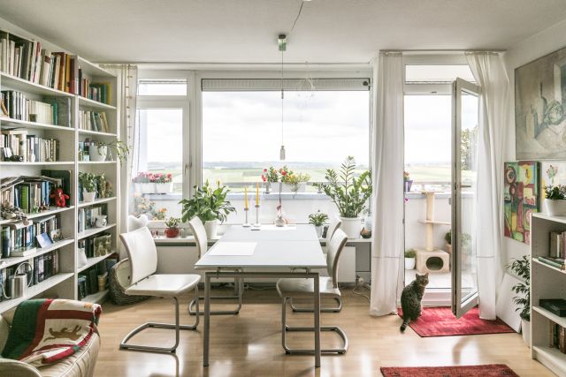 Ihre Wohnung ist Lebensraum und Atelier zugleich. Doch bevor man sich der Gastgeberin zuwenden kann, will Kater Bitzel begrüßt werden. Habet ist erklärte Katzenfreundin und hat den vierjährigen Kater vor einem halben Jahr adoptiert, nachdem ihre alte Katze verstorben war. „Er hat sich mittlerweile gut eingewöhnt. Und er genießt die Aussicht vom Balkon.“ Der ist zur Sicherheit mit einem Netz verspannt, lässt aber freie Sicht – Rheinhessen liegt dem Betrachter zu Füßen. Vom Esstisch im Wohnzimmer schweift der Blick über grüne Felder in allen Schattierungen. Das dunklere Laub des Ober-Olmer Waldes ist greifbar nahe. In der Ferne verschwimmt die Silhouette der Frankfurter Skyline. Und der Himmel ist endlos weit.