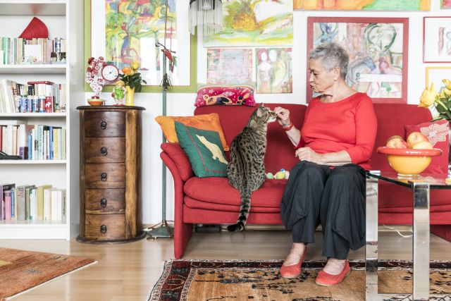 Neben der Wohnungstür hängt ein Gemälde, das an Chagall gemahnt. Zwischen den Türen zu den Nachbarwohnungen steht im Flur eine überlebensgroße Plastik mit Bezügen zu Picasso. Wenn man eingelassen wird, weiß man kaum, wo man zuerst den Blick hinwenden soll. Sind es die zahlreichen, farbenfrohen Bilder, die alle Wände bedecken, oder ist es der atemberaubende Blick aus dem Fenster?