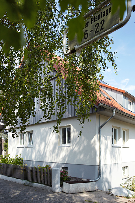 Weiter oben auf dem Dach fallen Photovoltaikmodule und Solarkollektoren ins Auge. Der Slogan auf der Fahne steht nicht umsonst hier. Mit enormem Aufwand wurde das ehemalige „Franzosenhaus“ aus den 50er Jahren in ein ökologisches Vorzeigeobjekt verwandelt. Dabei wurde versucht, den ursprünglichen Charakter des Gebäudes mit modernen Elementen zu kombinieren. Etwa 20 Häuser mit identischem Grundriss und einer ursprünglich sichtbaren Holzfassade stehen „An der Plantage“ in Mombach. Auch in Gonsenheim sind mehrere der so genannten „Franzosenhäuser“ erhalten. Ihre Gemeinsamkeit: Sie alle wurden nach dem zweiten Weltkrieg, als Mainz französische Besatzungszone war, für französische Offiziersfamilien in Fertigbauweise aus Holz gebaut. „Eine sehr bewegte Geschichte hat dieses Haus allerdings nicht. Es wurde 1953 gebaut, ist aber bereits 1957/58 in den Besitz eines deutschen Ehepaares übergegangen, von dem wir es dann 2008 gekauft haben“, erzählt Birgit Schößwender.