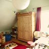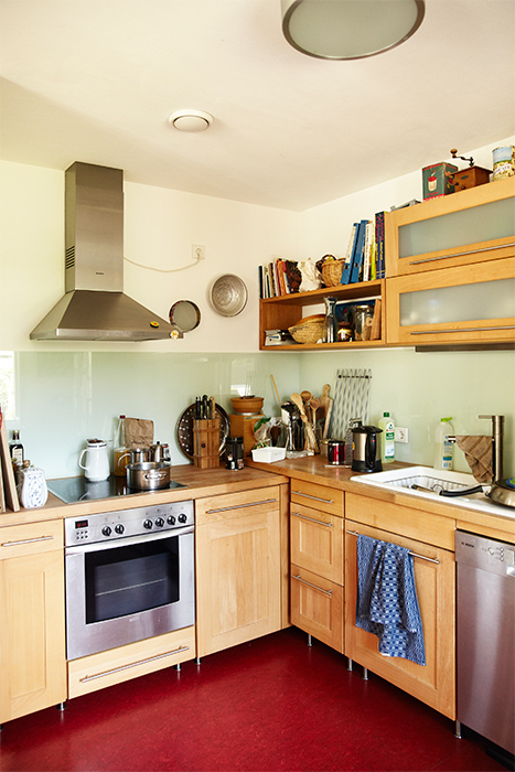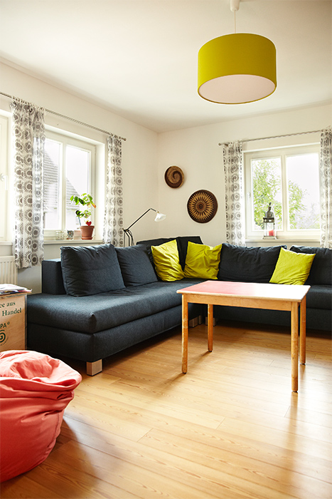 Die Bausubstanz war für die Eltern von zwei Töchtern (6 und 8 Jahre) eines der kaufentscheidenden Kriterien. „Wenn wir neu gebaut hätten, wäre es auch ein Holzhaus geworden. Der Vorteil hier ist unter anderem ein tolles Raumklima“, erklärt Schößwender. Und tatsächlich fühlt sich das Klima in den Räumen sehr angenehm an. Auch bei den Böden hat die Familie auf Holz gesetzt, was nicht nur dem geräumigen Ess-Wohnzimmer eine Extra-Portion Atmosphäre und Wärme verleiht. Auch die kleineren Räume im Obergeschoss strahlen Gemütlichkeit aus. Birgit Schößwender outet sich zudem als Fan von 50er- Jahre Architektur. Diese sei vor allem pragmatisch und im Vergleich zu den 60ern habe man relativ giftstoffarm gebaut. Dass die eine Dachhälfte des Hauses perfekt nach Süden ausgerichtet ist, passte in die ehrgeizigen Pläne des Ehepaares, so auch die Nutzung von Sonnenenergie einzubeziehen.