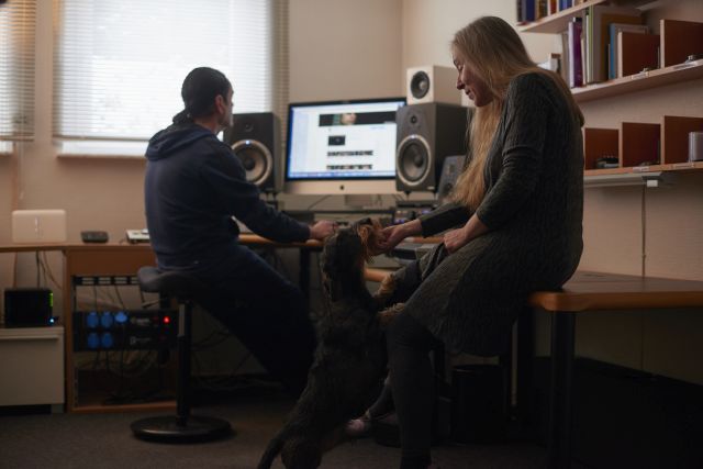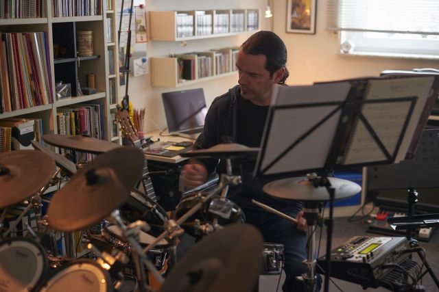 Achim schlägt lieber härtere Töne in seinem Bandkeller an, der durch Schallschutztüren von Beates Bereich getrennt ist. Gitarre, E-Gitarre und E-Bass hängen hier an den Wänden. Auch digitales Schlagzeug steht auf der Tagesordnung. Seine Schüler spielen alles zwischen Jazz und Metal. Die Hightech-Instrumente können ihren Sound auf Boxen oder Kopfhörer abgeben – so müssen die Nachbarn nicht zwingend leiden. Per Knopfdruck wird der Klang der digitalen Schlagzeuge variiert: egal ob klassisch, Jazz, indisch oder synthetisch. Auch ohne Drummer spielt das Gerät einen Rhythmus, der Achims Gitarrenspiel begleitet. „Als Gitarrist braucht man Fingerspitzengefühl. Das ist nicht für jeden etwas“, improvisiert er lässig eine Melodie auf seinem Instrument. Sein Spezialgebiet ist die Jazzgitarre. Im eigenen Musikverlag (Name: „Klangfarbe“) bringt er Lehrbücher heraus, mit diversen Grifftabellen. Zusätzlich produziert er im Nebenraum Erklärvideos für seinen YouTube-Kanal.