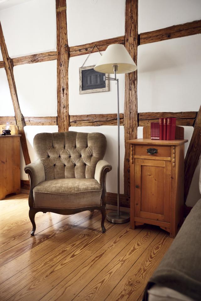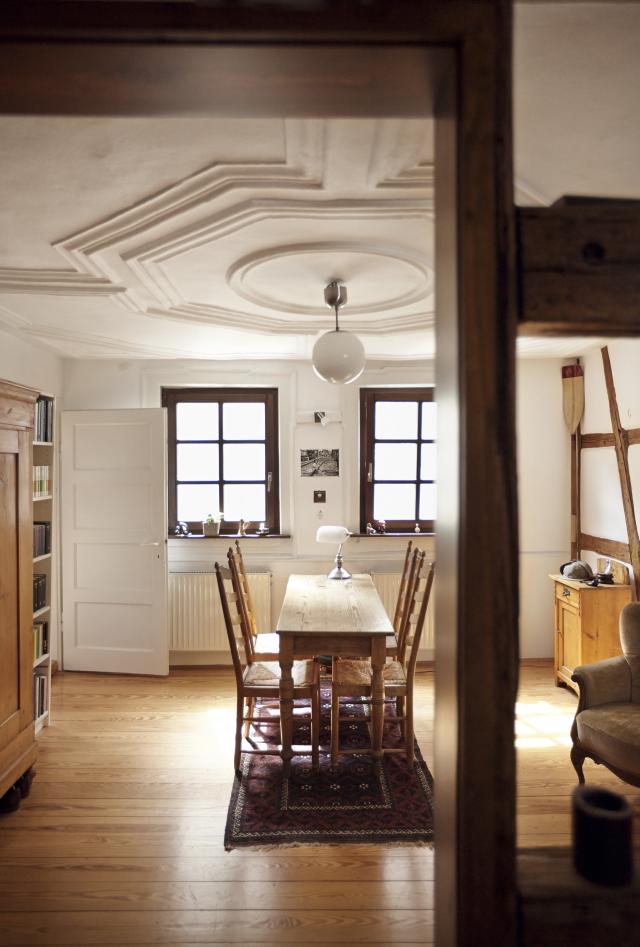 Der alte Esstisch aus hellem Holz, im größeren der beiden Räume, drum herum Stühle mit Sitzen aus Binsengeflecht, ist zugleich auch Arbeitstisch. Eine Chaiselongue, ein großer Weichholzschrank, daneben Regale. Viele Bücher, aber nicht alle passen in die Borde. „Ein Teil liegt unterm Bett“, gesteht der Autor. Der Stuck an der Decke, ungewöhnlich für ein Fachwerkhaus, ist ein Hinweis darauf, dass das Haus, obwohl klein, doch mal „was Besseres“ war.