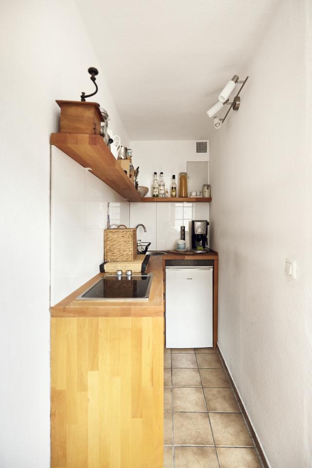 Mit Raffinesse und Hilfe eines Freundes wurde aus dem 95 cm breiten Schlauch ein komplettes Bad mit Waschbecken, Wanne und WC. Das Klo auf halber Treppe, an das noch eine Tür erinnert, hatte ausgedient.Vom „neuen Luxusbad“ führt die eine Tür zum Arbeits-, Ess- und Wohnraum, durch die zweite gelangt man ins Schlafzimmer. Mehr als ein großes Bett ist hier „nicht drin“. Aber: „durch diesen „Rundlauf“ wirkt die Wohnung größer als sie ist“, kommentiert der Schriftsteller sein „Boot“.