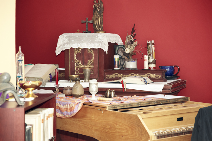 Das Cembalo auf der Galerie zupft er gelegentlich an, mehr noch liegt ihm der Gesang. Von Kindesbeinen an bis zum vierten Studiensemester singt er in verschiedenen Chören. Sein Musikgeschmack ist klassisch, lässt aber neben Mozart und Bach auch Silbermond und Andrew Lloyd Webber zu. Ansonsten ist der Haushalt sakral geprägt: Neben einem alten, hölzernen Altar mit Kerzen, Kelchen und Kreuz steht ein kniehohes Figurenpaar mit Merkels Namenspatron: die Taufe Jesu durch Johannes den Täufer. „Das war ein Geschenk zur Primiz, meiner ersten Messe, die ich nach der Priesterweihe 1983 als Hauptzelebrant hielt“, und fügt scherzend hinzu, dass dies so etwas wie die Hochzeitsnacht des Priesters sei. Seine Predigten bereitet er am Notebook vor – zu Hause, im Dom oder im Bischöflichen Ordinariat. Schreibblockaden geht er mit Spaziergängen am Rhein aus dem Weg oder er lässt seinen Gedanken beim Blick auf den Markt freien Lauf. Von Sammelleidenschaft zeugen viele Bücher in den Regalen und die mit kleinen, vornehmlich gelben Klumpen gefüllten Glasgefäße: Weihrauch, ein kostbares Harz. Manchmal verglimmen hier ein paar dieser Körnchen und Johannes Merkel genießt den aromatisch duftenden Rauch außerhalb der Liturgie mit Erinnerungen an ferne Länder und Abenteuer.