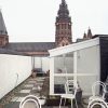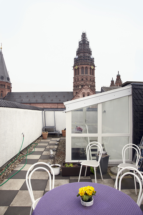 Hinter der im engen Seitengässchen versteckten Eingangstür führt ein fensterloser Aufgang zu seiner lichtdurchfluteten Maisonette-Wohnung. Erklimmt man zwei weitere Treppenaufgänge, tritt man durch den Glasaufbau auf die Dachloggia. Die Brüstung ringsherum ist mannshoch. Kleine Auftritte eröffnen eine grandiose Aussicht, die auch gerne von Kamerateams genutzt wird. Hier verbringt Johannes Merkel gerne Zeit mit Freunden, Elektrogrill, Büchern oder einfach nur einer Tube Sonnencreme. Einzig beobachtet von dem gegenüber auf dem Domgiebel balancierenden St. Martin hoch zu Ross. Unter einer Reihe kleiner Dachfenster befindet sich das Schlafgemach – nachts offenbart es den Blick in den Sternenhimmel. Das Tischchen mit flottem Stoffüberwurf neben dem Bett hat seine eigene Geschichte: „Unter dem Tuch stehen unausgepackte Umzugskisten“, Merkel wohnt hier seit drei Jahren und grinst verschmitzt. Die farbenfroh angelegten Wände spiegeln sein heiteres Gemüt wieder. Er mag seine Wohnung, auch wenn sie sich wegen der nach oben hin verjüngenden Zimmer nicht unbedingt zum Schrankaufstellen eignet.