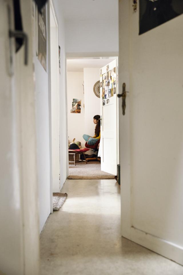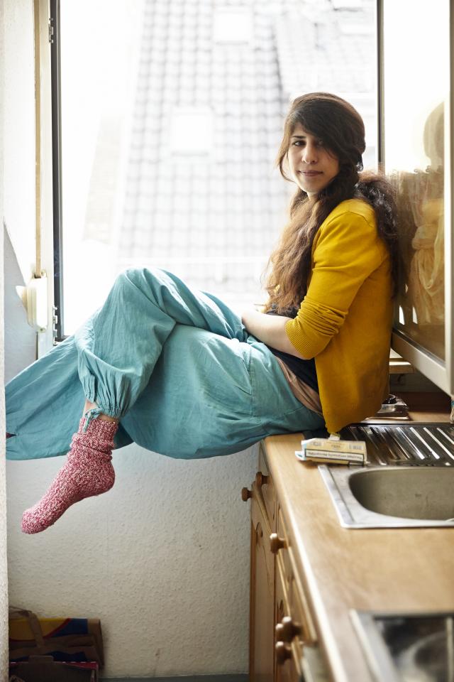 Zur Rechten befindet sich die Mini-Küche, ein schmaler Schlauch, von dem die Gastronomie-Arbeiterin sagt: „Man darf nicht zunehmen, wenn man hier wohnt!“ Dabei lacht sie ihr sympathisches Lachen und weist sogleich auf eine Besonderheit ihres Heims hin: Die Dusche befindet sich hinter einem Vorhang in der Küche, die kleine Toilette ist gegenüber mit einer Tür räumlich abgetrennt – eine besonders offene Variante des Frankfurter Bads also. Am Ende des Schlauchraums sitzt Nikan gerne mit einer Zigarette und genießt den Blick über den Innenhof. „Hier fühle ich mich fast wie im Urlaub“, sagt sie und erzählt mit Fingerzeig auf die umliegenden Balkone von ihren liebgewonnenen Nachbarn, wie der Frau im Nebenhaus, für die sie manchmal am offenen Fenster singt.