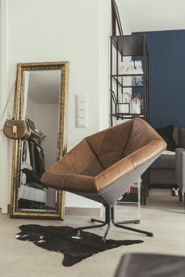 Larissa Gallandi öffnet die Tür und strahlt. „Homestories“ habe sie immer schon gerne gelesen, sagt sie, und freut sich, dass jetzt auch ihre Wohnung einmal dabei ist. Die offene Garderobe mit Leo-Mantel am Eingang kommt uns bekannt vor: Larissa hat sie auf ihrem Mode- und Lifestyleblog „styleGLOW“ vorgestellt, gesponsert vom Hersteller. Ein Schritt noch und wir befinden uns in ihrem großzügigem Wohn-, Ess- und Arbeitsbereich. Erste Sonnenstrahlen fallen durch die hohe Terrassentür. Draußen stehen Stühle für sommerliche Grillabende bereit, drinnen bieten Hocker am Esstisch und die gemütliche Sofaecke bequemen Platz für viel Besuch. Die passenden Getränke stehen auf dem gläsernen Barregal und im Weinkühlschrank bereit.
