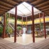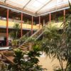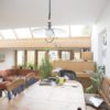 Betritt man die Anlage, steht man im großzügigen überdachten Innenhof mit hohen Grünpflanzen, Sofaecke und einem langen Tisch. Das wirkt einladend wie ein kleiner Marktplatz im Süden – ein Dorfmittelpunkt en miniature. „In der Zeit, als die Kinder klein waren, war dies hier ein geschützter Platz zum Spielen“, erinnert sich Müller. Von hier aus führen die Eingangstüren in die einzelnen Häuser und man sieht: Das Leben im Haus zieht sich mit Schuhregalen, Wäscheständern oder Bank neben der Haustür auch in den Innenhof hinaus.