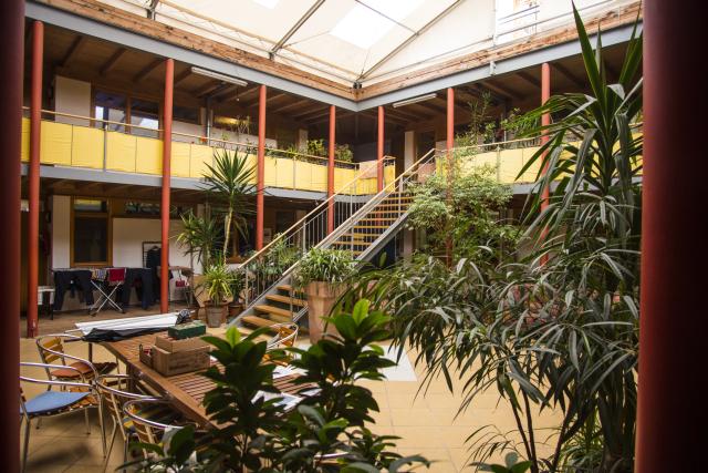 Betritt man die Anlage, steht man im großzügigen überdachten Innenhof mit hohen Grünpflanzen, Sofaecke und einem langen Tisch. Das wirkt einladend wie ein kleiner Marktplatz im Süden – ein Dorfmittelpunkt en miniature. „In der Zeit, als die Kinder klein waren, war dies hier ein geschützter Platz zum Spielen“, erinnert sich Müller. Von hier aus führen die Eingangstüren in die einzelnen Häuser und man sieht: Das Leben im Haus zieht sich mit Schuhregalen, Wäscheständern oder Bank neben der Haustür auch in den Innenhof hinaus.