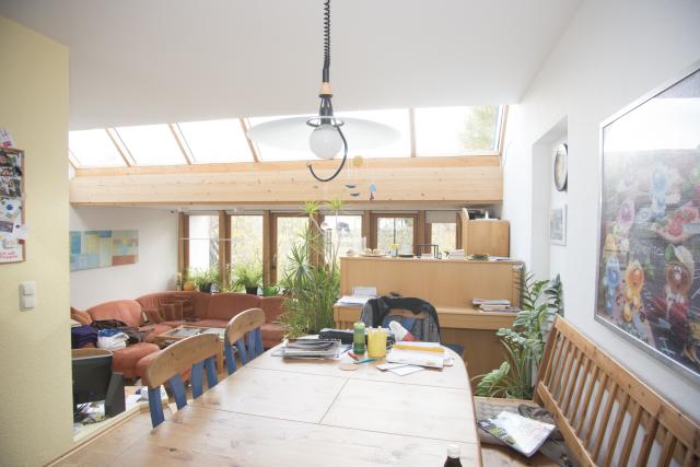 In der Bauphase wurde vieles gemeinsam gemacht. Es war immer einer da, der sich auskannte. „Es ist sinnvoll, zusammenzuarbeiten“, stellt Gabi Müller fest. Die Eigentümer sind Lehrer, Erzieher, Energieberater, Ökotrophologen, Ingenieure und Betriebswirte… eine bunte Mischung, die sich vor mehr als zwanzig Jahren zusammengefunden hat, um gemeinsam zu bauen. Drei Familien bildeten die ursprüngliche Planungsgruppe. „Als es in die Bauphase ging, waren alle dabei, die heute noch hier leben.“ Vieles wurde in dieser Zeit gemeinsam auf die Beine gestellt. Davon, dass ökologische Ideen einbezogen wurden, zeugen auch die verwendeten Farben, Dämmung und Regenwasser- Zisternen.
