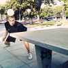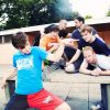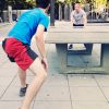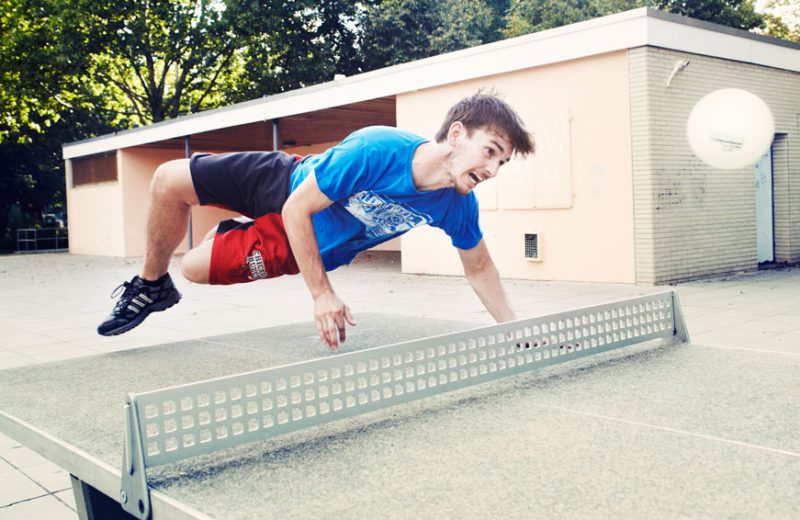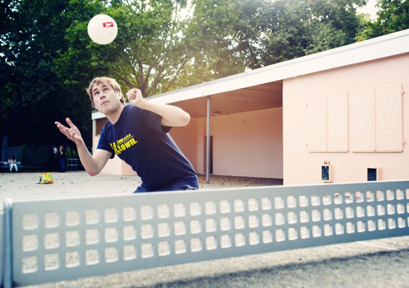 Zeit für die erste Partie des Tages, Heiko spielt gegen Tommy Freestyle, unter diesem Namen ist Tommy auch als Freestyle-Fußballer unterwegs. Obwohl er schon ins Schwitzen gekommen ist, nutzt er die Spielpausen, um sein Publikum mit Ballakrobatik zu begeistern. Heiko beeindruckt mit seinen Volleyannahmen, dafür hechtet er todesmutig auf die Tischtennisplatte. Nicht nur bei den Kindern, die mit ihren Rädern um die Platte kurven, hat er mit seinen Flugeinlagen Eindruck geschindet. Heikos Volleykünste sind übrigens „new school shit“, sagt Thomas, denn auch Headis hat sich seit Schwimmbadtagen technisch weiterentwickelt. Welche Tipps sollte ein Anfänger befolgen? „Auf die richtige Position kommt es an, immer an der Mitte der Platte stehen, um returnen zu können und dabei tief in die Knie gehen, dann behält man die Übersicht“, rät Thomas. Wer die Tipps und Headis ausprobieren möchte, kann entweder bei gutem Wetter spontan zum Goetheplatz kommen oder sich bei Thomas per EMail melden: reiti83@yahoo.de