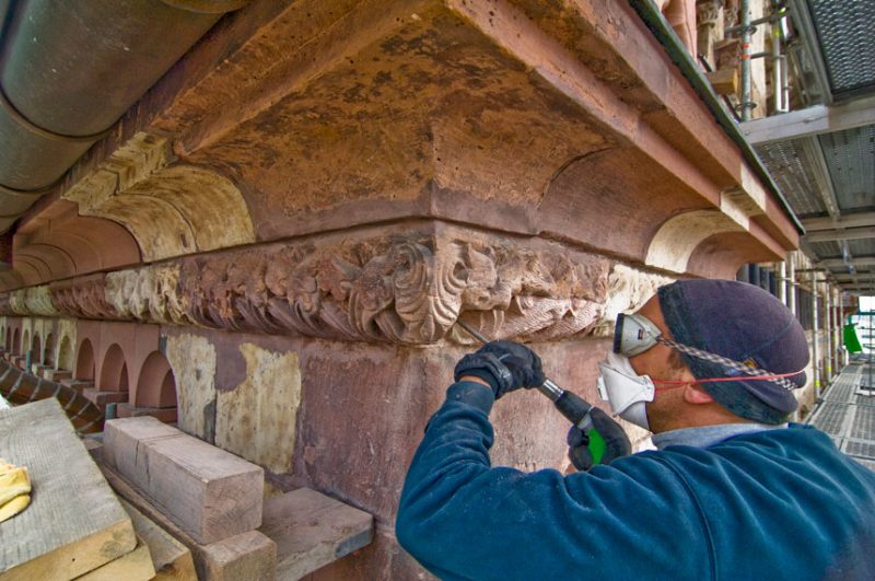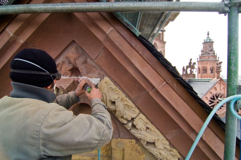 Kommunikation untereinander ist ein wichtiger Aspekt. Schon seit Jahren hält die Mainzer Dombauhütte regelmäßig Kontakt zu anderen Kollegen etwa in Köln, Freiburg, Passau oder Xanten, dazu kommen wissenschaftliche Tagungen der Dombaumeister, die mit Fachleuten diskutieren. „Natürlich muss man wissen, an was die Forschung arbeitet, welche Entwicklungen und neue Verfahren es bei der Steinkonservierung gibt“, ergänzt Walter, „aber andererseits darf man auch nicht jedem neuen Trend nachlaufen, wir denken eben beim Dom in ganz anderen Zeitläuften als etwa ein Immobilienbesitzer.“