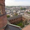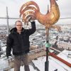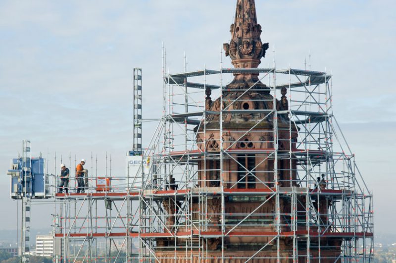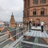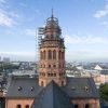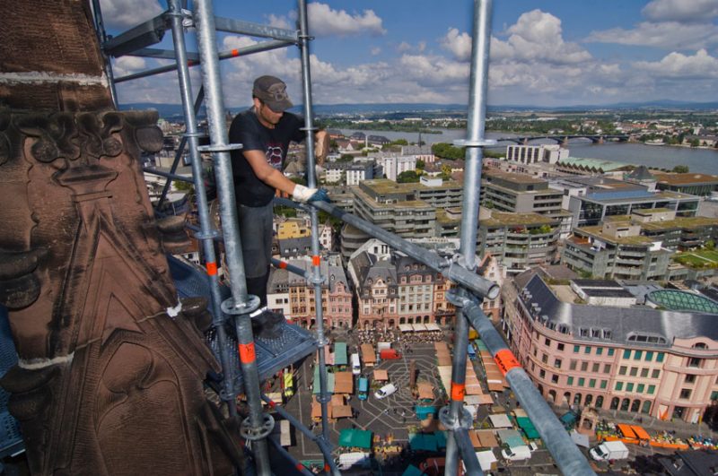 Fast 84 Meter liegen vor ihm und zwar steil nach oben. Über drei Lastenaufzüge und eine mehr als zehn Tonnen schwere Gerüstbrücke klettert Dominik Schäfer hoch hinaus, immer an der Wand lang, bis zum Domsgickel. Aug in Aug mit dem Wetterhahn bleibt der 27-Jährige kurz stehen und dreht sich um. Mainz von oben. Ein atemberaubender Blick über den Dächern der Stadt. Nur wenige werden die Aussicht genießen können, ein paar Fotografen waren schon hier, Kunsthistoriker, natürlich die Gerüstbauer – aber sie alle sind nur auf Kurzbesuch, für ihn und seine Steinmetzkollegen wird der eingerüstete West-Turm des Mainzer Doms die kommenden drei Jahre wichtigster Arbeitsplatz sein.