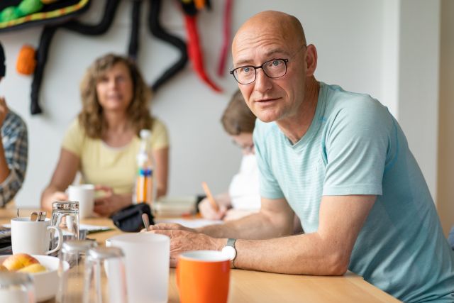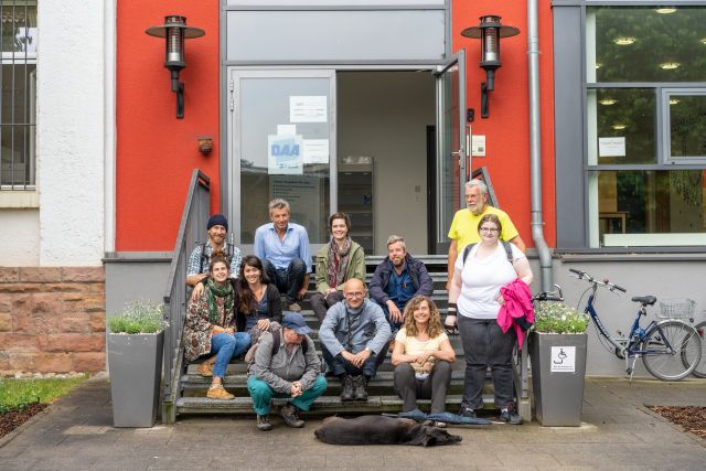 Auch auf dem Dach des Staatstheaters wird geimkert. In luftiger Höhe stehen vier weitere Beuten, die Wolf und Haas mitbetreuen. Nur wenige Meter Luftlinie entfernt blühen dutzende Balkone und Dachterrassen, zwischen den Häusern ragen teils Baumspitzen hervor. Nahrung wird den Theaterbienen also praktisch vor die Haustür geliefert. Die Kästen sind Teil des Projektes „Soziale Stadtimkerei“ der Gesellschaft für psychosoziale Einrichtungen (gpe). Das Projekt unterhält seit etwa einem Jahr 20 Bienenvölker im Stadtgebiet. Bei den wöchentlichen Treffen lernen die Teilnehmer die theoretischen Grundlagen des Imkerns, besuchen Imker in der Umgebung und legen selbst Hand an. In der heutigen Sitzung werden Mittelwände für die Beuten hergestellt. Sie bestehen aus Bienenwachs und imitieren die natürliche Bauweise der Bienen. In weiteren Stunden wird beigebracht, wie man Honig schleudert und welche Arten von Beuten es gibt. Die Kurse bringen jedoch keine fertigen Imker hervor. Vielmehr verfolgen sie das Ziel, Menschen mit und ohne Beeinträchtigung aus den verschiedensten Milieus zusammenzubringen und für das Thema zu begeistern.
