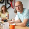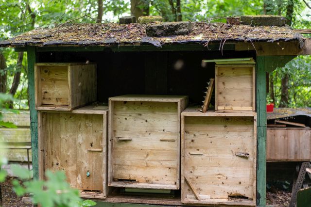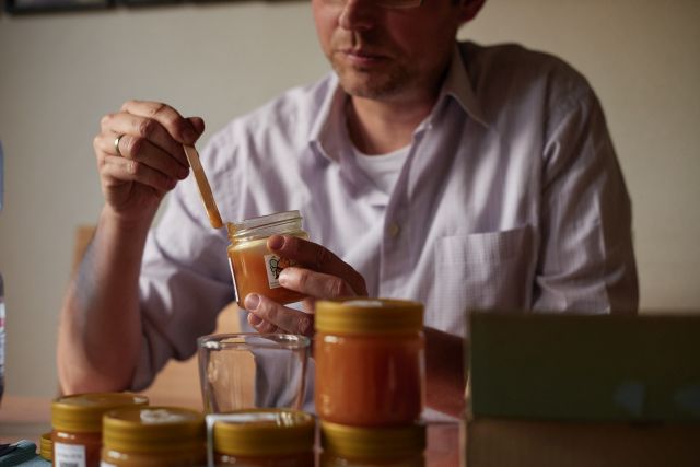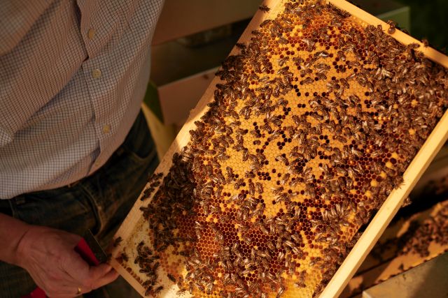 Im Gonsbachtal, nicht weit der Imkerei, verstecken sich die Bienen von Franz Botens hinter Bäumen und Hecken. Man könnte meinen, man stünde mitten im Wald, würde nicht alle paar Minuten ein Regionalzug die Stille durchbrechen. Es regnet etwas, doch das scheint den Imker nicht zu stören. Ohne Regenjacke oder Schutzanzug öffnet er die Beuten, zieht Rähmchen voller Bienen und Honig heraus. „Ahh, wunderbar, hier kann man direkt probieren“, lädt er uns ein und schwenkt seinen Finger durch den frischen, warmen Honig. Auch Botens setzt auf innerstädtische Bienen und hält weitere Völker auf dem Dach des Hyatt-Hotels. So produziert er etwa zwei Tonnen Bio-zertifizierten Honig pro Jahr, den man im natürlich und bei Denn’s Biomarkt findet.