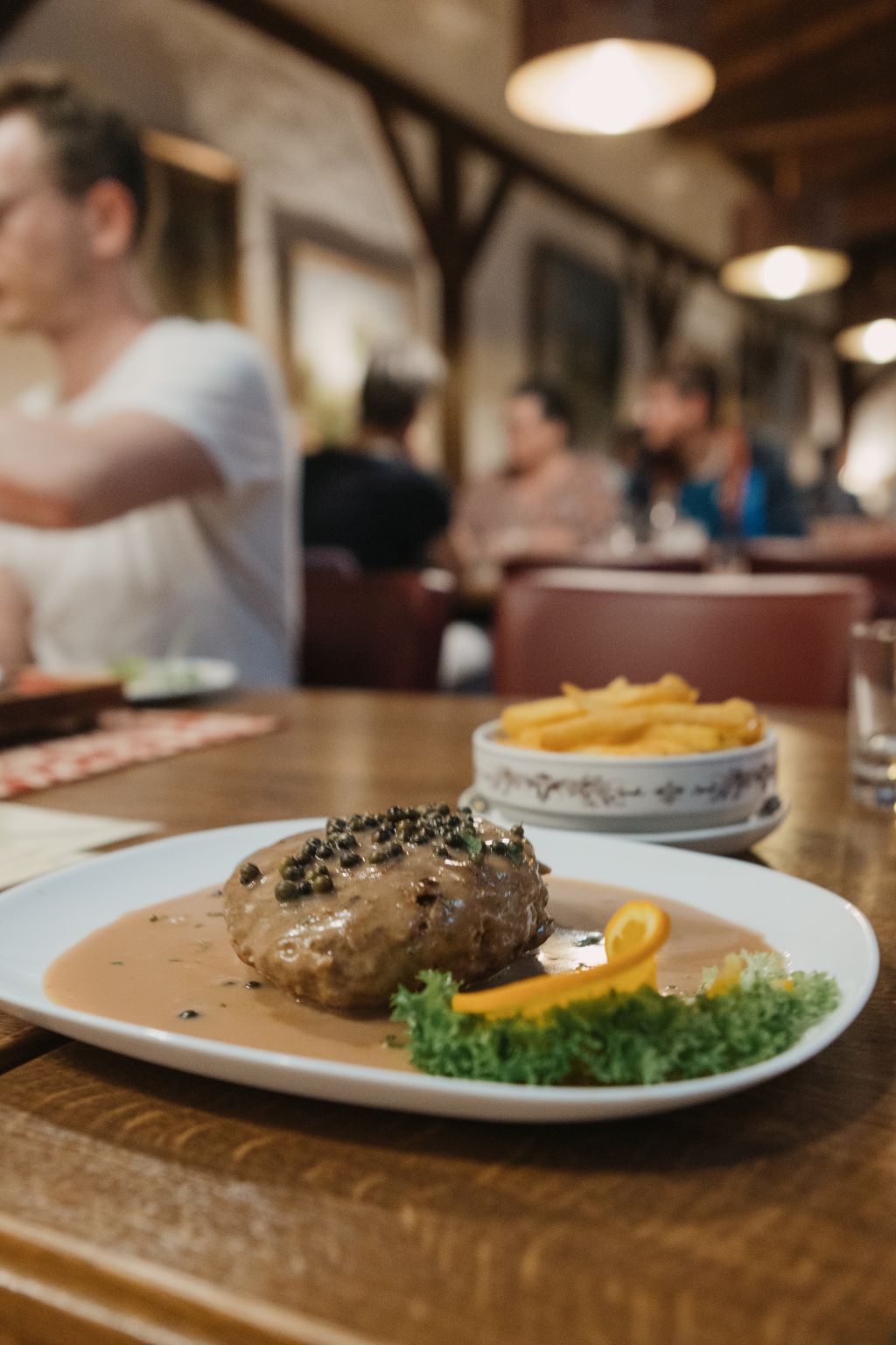 Tatsächlich ist der idyllisch und reich bepflanzte Innenhof gerade bei sonnigen Temperaturen unbedingt einen Ausflug wert. Aber auch die vor viereinhalb Jahren renovierte Gaststube hat einiges zu bieten. Hier trifft Uriges auf Modernes. Schmuckstück ist der rote Salon, ein separater Raum, der für Feierlichkeiten gebucht werden kann. Und wie in einem Gutsausschank eben üblich, entdeckt man auf der Speisekarte gut-bürgerliche Gerichte, die ehrlich und handfest zubereitet werden. Die Karte bietet Klassisches mit kleineren Variationen. Neben dem „Meenzer Handkäs“ gibt es auch eine mediterrane Version mit Oliven, eingelegten Tomaten und Balsamico Creme. Zum Ambiente passend lockt alternativ der eingelegte Feta mit Oliven, Kräutern, Peperoni, Knoblauch und Baguette oder ein Forellenfilet, geräuchert in Wacholder. Flämische Bauernsülze mit Frankfurter grüner Sauce und hausgemachter Wurstsalat mit Emmentaler Käse sind fest im Programm.