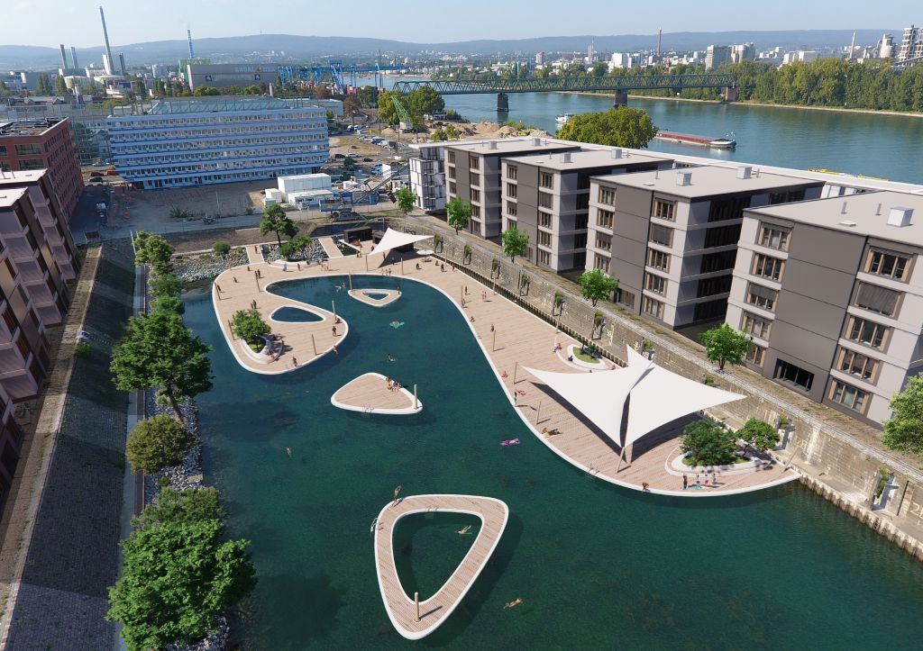 schwimmen, und über Nacht wäre es wieder gereinigt. Dafür benötigt Kiefer die Unterstützung der Anwohner und vor allem Investitionen. Und er möchte das Thema in den Stadtrat bringen. Unterstützung wurde zuletzt durch den neuen OB Nino Haase signalisiert. Zeitnah sollen nun erste Ergebnisse zum Lärmschutz vorliegen. „Man braucht Rechtssicherheit bei solchen Projekten”, erklärt Kiefer die Bedeutung der Gutachten. Im Zollhafen kommen viele Menschen aus der Region zusammen, um hier zu leben und zu arbeiten. Nach der Fertigstellung aller Baufelder werden dort 2.500 Menschen wohnen und 4.000 Arbeitsplätze für Menschen entstehen, die nicht alle aus Mainz kommen. Erfahrungsgemäß und bestätigt durch Gespräche mit den Anwohnern ist die „Nachbar- Anonymität“ noch ein Thema. Der fortschreitenden Gentrifizierung und Entfremdung in der Neustadt könne mit einem Naturbad auch nicht schlecht entgegengewirkt werden.