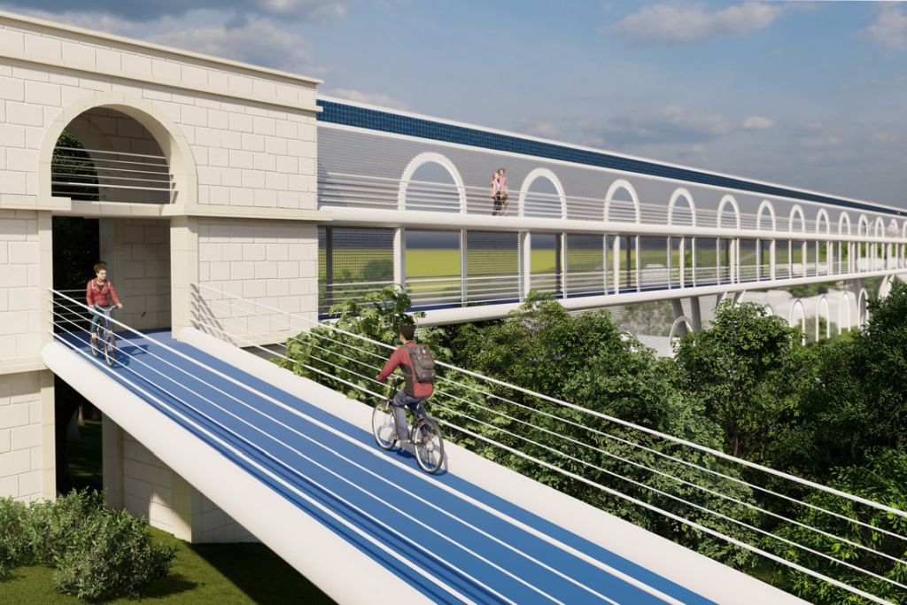Strecke von 700 Metern die längste Fahrradbrücke Deutschlands. Das Konzept sieht vor, dass Radfahrern auf einer unteren Ebene zwei Fahrspuren zur Verfügung stehen. Die Etage darüber gehört den Fußgängern, die bei ihrem täglichen Weg zur Arbeit oder an die Uni den Ausblick über das Zahlbachtal genießen. Über Solarpanele, die an den Wasserlauf der Römer erinnern, soll tagsüber Strom gespeichert werden, um das „Velodukt“ bei Nacht zu beleuchten. Durch moderne LED-Technik lasse sich das Licht flexibel steuern und könne bedarfsorientiert, energetisch und umwelttechnisch optimiert werden, so Efferth. Durch den spektakulären Bau erhoffen sich die Planer zudem eine Entlastung der Saarstraße. Angebunden an das Stadion mit seinen rund 1.000 Park & Ride-Parkplätzen und einem Leihradsystem, stünde das „Velodukt“ für die Verknüpfung eines wichtigen Knotenpunktes in Richtung Grüngürtel der Oberstadt. Von dort aus ließen sich weitere Radwege erreichen. Und ganz nebenbei hätte Mainz ein Wahrzeichen, das die Erinnerung an die Römerzeit aufrechterhält und für ein modernes Mobilitätskonzept steht.