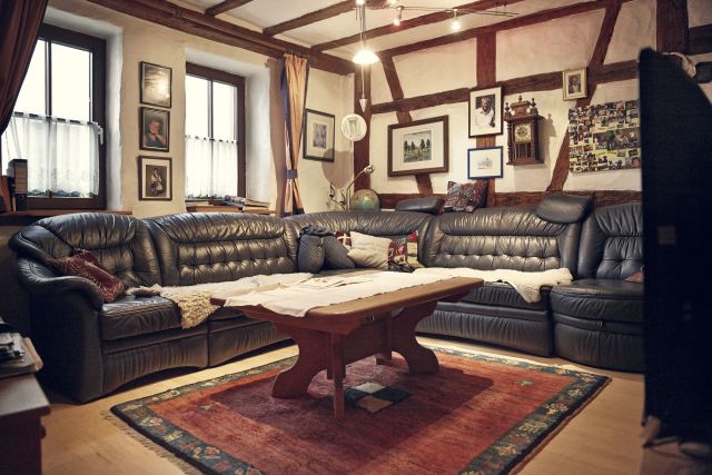 „Der Umbau wurde zu einem Abenteuer, wie wir es uns nicht vorgestellt hatten.“ Beide blättern durch die Bilder: Kaputte Fußboden-Dielen, an den Deckenbalken noch heute die Spuren des Hausbocks. Mario lacht: „Wir haben damals viel selbst gemacht. Sogar den Lehm für die Gefache haben wir ausgegraben. Mein Vater und Großvater haben uns dabei geholfen, beide sehr gute Handwerker.“ Vier Jahre dauerte die erste Phase der Renovierung. In dieser Zeit kamen auch zwei ihrer drei Söhne zur Welt. Alte Fotos zeigen Tobias, den Ältesten, im Kinderwagen auf der Baustelle; später mit seinem kleinen Bruder Simon im Hof, das Haus immer noch mit Gerüst. „Dann sind wir eingezogen. Das Dach kam erst danach dran“.