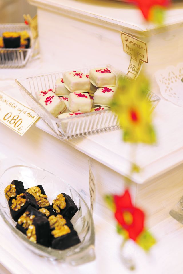 Die Besitzer führen ihr Geschäft am Kirschgarten nun seit etwa drei Jahren. Vorher leiteten sie zusammen 30 Jahre lang eine Tengelmann-Filiale. Dann kam die Übernahme durch REWE – ein Riesenschock für beide. Schnell war klar, dass es für sie dort keine Zukunft mehr gibt. Das Paar hatte Angst um seine Jobs und auch die Identifikation mit dem vorherigen Konkurrenten sei ihnen schwer gefallen. „Wir waren für die Rente zu jung und zum Arbeit suchen zu alt“, erinnert sich Gisela. Also musste ein neuer Plan her: die Selbstständigkeit. „Wir haben uns gedacht, was im Großen mit 30 Mitarbeitern funktioniert, das könnte eigentlich auch im kleinen Rahmen funktionieren.“ Auf die Frage, warum es gerade ein Schokoladengeschäft geworden ist, lächelt Gisela: „Weil wir beide sehr gerne naschen.“ Bei den ersten Schritten in die Selbstständigkeit half ein Marketingberater. Die beste Verkaufsidee kam ihnen aber letztlich selbst: das Pralinchen auf die Hand. Schon ein Schild vor der Tür weist auf „Pralinen ab 50 Cent“ hin, die man direkt auf einer Serviette mitnehmen kann. Die einfache Idee lohnt sich, denn wer einmal etwas probiert hat, kommt meistens mit mehr Zeit wieder.