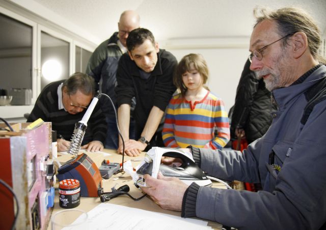 Im Winter ist im Garten nicht so viel zu tun. Umso mehr Betrieb herrscht im Repair-Café im „Haus der evangelischen Kirche“ auf der Mainzer Kaiserstraße. Seit April 2013 (wir berichteten) kann man hier der „geplanten Obsoleszenz“ entgegenwirken. Das Repair- Café ist ein Kooperationsprojekt der evangelischen Kirche und Transition-Town Mainz. „Wir sind sehr froh darüber, dass uns die Kirche diesen Raum zu Verfügung stellt“, sagt Gisela Apitzsch, die Beauftragte für Gesellschaftliche Verantwortung im evangelischen Dekanat Mainz. Im „Repair-Center“ im vierten Stock häufen sich auf den Tischen Werkzeuge, Kabel und zu reparierende Geräte. Elf Reparierer sind an diesem Abend da, um ihr Know-How einzubringen. Insgesamt sind es fast 20, die regelmäßig kommen. Und die Nachfrage ist riesig! Zeitweilig stehen die Reparatur-Klienten Schlange. Heiko ist einer der Tüftler und zum ersten Mal im Café. „Ich kenne das Konzept aus Köln“, sagt er und schraubt am Radio von Anna Dorscht. Die kann sich schon bald wieder über Musikgenuss freuen: Es war nur ein Wackelkontakt. Alle Altersstufen sind im Repair-Café vertreten und die Reparierer lernen auch voneinander. „Geplant ist auch eine Art von Seminaren zu veranstalten, wo Fachmänner oder –frauen Grundlagen von Reparaturtechniken vermitteln“, sagt Apitzsch. Heinrich Jung, der mit der „Blitzblume“ in Ingelheim das Reparieren von (fast) Allem zu seinem Beruf gemacht hat, repariert er auch hier – ehrenamtlich, versteht sich. „Ich bin halt Überzeugungstäter“, meint er, „das ist mein Lebenszweck.“ Eine Dame nähert sich: „Sind sie grade arbeitslos?“ und reicht ihm eine Kaffeemaschine: „Die ist undicht“, und Jung macht sich sofort an die Arbeit. „Das Modell kennen wir schon!“ Tüchtige Reparateure sind auch die Eheleute Kaiser, die von Anfang an dabei waren. Irma Kaiser betreut auch die neue Kleidertausch-Initiative, die seit Januar zu den gleichen Terminen wie das Repair-Café etwa einmal im Monat stattfindet. Die aktuellen Termine finden sich auf der Website. Am Eröffnungstag der Kleidertauschbörse war gleichzeitig auch großer „Pressebahnhof“, denn der rheinland-pfälzische Minister für Justiz und Verbraucherschutz Jochen Hartloff war gekommen. Allerdings nicht, weil er Krawatten tauschen wollte, sondern um sich über das Repair-Café zu informieren. Er weist zwar darauf hin, dass auch die Produktion von neuen Elektrogeräten wichtig für den Markt sei, lobt aber die Initiative der Repairer sehr. „Wir waren die ersten in Rheinland-Pfalz und unser Beispiel macht Schule“, freut sich Apitzsch. Trotzdem ist sie nicht ganz zufrieden und erhofft sich tätige Hilfe vom Ministerium: „Wir brauchen dringend eine Werkstatt, in der die Geräte und Werkzeuge bleiben können.“ Das sagen auch Daniel Panitsch und Matthias Diefenbach, die gemeinsam mit zwei weiteren Mitstreitern im vergangenen Jahr jede Woche im Pengland ihre „Bike-Kitchen“ Fahrradreparatur- Selbsthilfewerkstatt öffneten und im Repair-Café monatlich eine „Dependance“ unterhalten. Die Räder und auch das nötige Werkzeug immer bis in den vierten Stock zu transportieren kann jedoch keine Dauerlösung sein. Wiesbaden-im-Wandel hat natürlich auch sein Repair-Café. „Das hat sich schnell rumgesprochen“, erzählt Anne Nellen. „Jeden dritten Samstag im Monat kommen wenigstens 20 Leute, um Sachen reparieren zu lassen und zehn bis zwölf Leute sind da, um zu reparieren.“ In Ina-Marina Dressels „Café Anderswo“ in der Blücherstraße geht es Elektro-Kleingeräten und Computern an den „kaputten Kragen“, im Hof werden Fahrräder repariert und Textilien in der Nähwerkstatt. „Wir haben Glück, dass wir die Räume der Wohngenossenschaft nutzen können“, sagt Nellen, die gemeinsam mit den beiden anderen Gründern dieser Gruppe auch den Kontakt zum Repair-Café des Volksbildungswerks in Klarenthal hält.