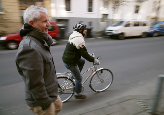 Etwa ein Viertel des Energieverbrauchs entfällt auf die Mobilität. Und das heißt vor allem auf den Individualverkehr mit dem eigenen PKW. Robert Buchmann ist Sozialpädagoge und Mitglied der Wiesbadener „Gruppe Mobilität“. Zum Treffen im „Anderswo“ kommt er dynamisch mit dem Fahrrad. Aber er ist genervt: „In der alten, gewachsenen Stadt wurde viel für den Autoverkehr geplant.“ Fußgänger und Radfahrer kamen dabei zu kurz. „Die Gehwege sind zugeparkt, besonders am Abend“, klagt er und sagt: „Es gibt eine Menge Menschen, die gerne Rad fahren würden, sich damit aber überfordert fühlen.“ Kein Wunder, gerät doch eine Fahrt durch die Stadt zum lebensgefährlichen Slalom. „Es ist für alle schrecklich“, sagt er. Auch für die Autofahrer. Die „Verkehrswende“ muss her! Was die vierköpfige Gruppe nicht will, ist es, die Autos ganz zu verdammen. „Es darf nicht immer nur jeweils ein Verkehrsmittel betrachtet werden.“ Öffentlicher Personen Nahverkehr (ÖPNV), Fahrräder und privater PKW oder Carsharing sollen nebeneinander Bestand haben können. Auch der Busverkehr ist in Wiesbaden an seine Grenzen geraten. „Wiesbaden hat seinerzeit die Busspur erfunden, aber dabei ist die Entwicklung dann hängengeblieben.“ Die Gruppe ist darum im Verkehrswendebündnis aktiv, gemeinsam mit dem Verkehrsclub Deutschland (VCD), der unter dem Motto „so viel wie nötig, so wenig wie möglich“, einen nachhaltigen Umgang mit dem Auto propagiert. Auch der Allgemeine Deutsche Fahrradclub (ADFC) beteiligt sich an der Organisation des Fahrradcorsos, der jeden 1. Donnerstag im Monat um 18 Uhr am Hauptbahnhof startet und sucht gemeinsam mit den anderen Organisationen den Dialog mit der Stadt. „Es geht um eine gerechtere Verteilung der Verkehrswegeanteile. Wenn wir auch den Autofahrern helfen wollen, müssen wir den Verkehrsteilnehmern insgesamt Alternativen bieten“, so Vielmeyer und Buchmann bestätigt: „In den Köpfen muss ein anderes Bild von Mobilität entstehen. Im September wird es daher das dritte Verkehrswendefest geben. Letztes Jahr hatte Sigrid Möricke, die Wiesbadener Dezernentin für Stadtentwicklung, Bau, Verkehr und Regionalentwicklung, die Schirmherrschaft übernommen, aber öffentliche Förderung gab es bis jetzt noch nicht.“